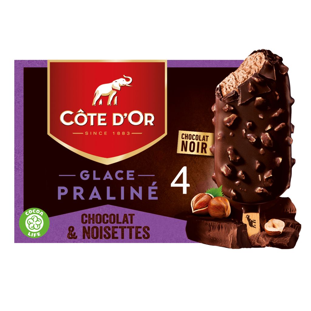 Bâtonnet de glace au praliné, enrobé de chocolat noir (36%) et des noisettes hachées grillées (6%)