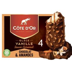 Découvrez toute la gourmandise Côte d'Or dans une nouvelle offre Caramel. Craquez pour sa coque de chocolat lait épaisse et ses amandes généreuses qui renferme une une sauce caramel fondante et une glace vanille onctueuse.