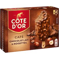 Découvrez toute l'intensité des tablettes de chocolat Côte d'Or dans une offre glace. Un bâtonnet gourmand au café, enrobé d'une épaisse coque de chocolat au lait Côte d'Or et de généreux morceaux de noisettes.
