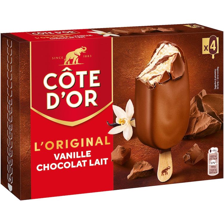 Découvrez toute l'intensité des tablettes de chocolat Côte d'Or dans une nouvelle offre en glace. Craquez pour son épaisse coque de chocolat lait Côte d'Or qui renferme une glace vanille onctueuse avec une feuilletage épais et craquant de chocolat Côte d'Or. Une nouvelle tentation qui séduira tous les adeptes de chocolat dans sa version la plus authentique.