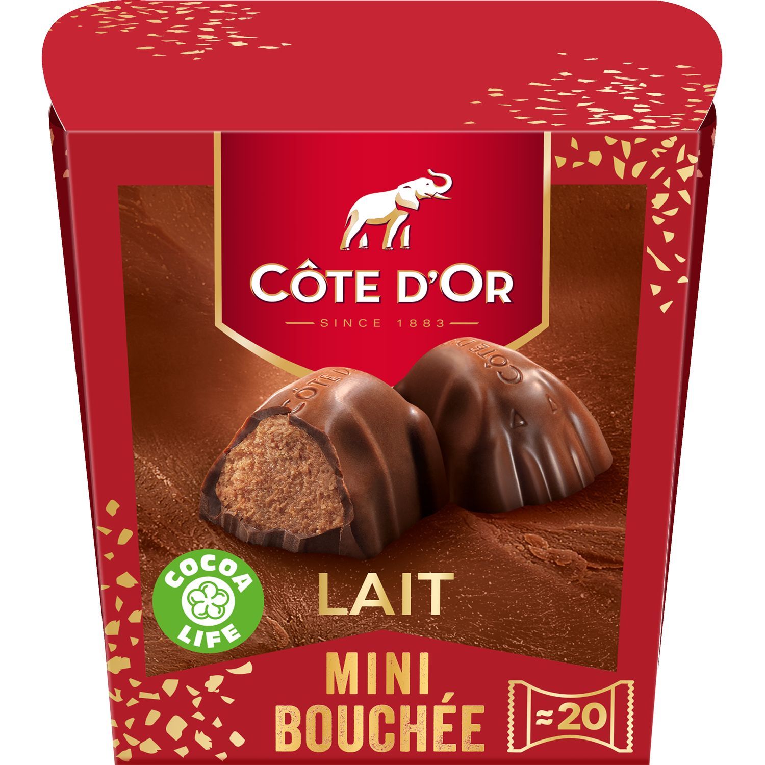 Fondez pour Mini Bouchée : un fourrage tendre et onctueux, sublimé par une savoureuse couche de chocolat au lait dont Côte d'Or a le secret. Chocolat au lait fourré (51%) crème confiseur aux noisettes et amandes.