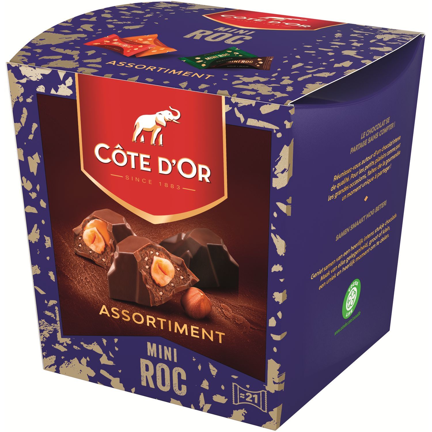 Chocolats assortis. A Noël, vibrez d'émotions avec Côte d'Or Mini Roc 4 recettes à partager avec ceux que vous aimez. Sous une couche de délicieux chocolat Côte d'Or, savourez une ganache onctueuse , parsemée de fins éclats croustillants, et au cœur, le croquant d'une noisette entière. Côte d'or sélectionne ses fèves de cacao de grande qualité à travers le monde pour donner à son chocolat ce caractère inimitable qui saura égayer vos fêtes de fin d'année.