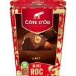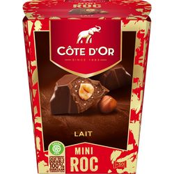 Redécouvrez les Mini Roc Côte d'Or : de délicieuses ganaches parsemées d'éclats croustillants, enrobées de chocolat au lait avec une noisette entière croquante au cœur. Et dans un plus grand format idéal pour égayer vos fêtes de fin d'année !