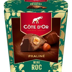 Redécouvrez les Mini Roc Côte d'Or : de délicieuses ganaches parsemées d'éclats croustillants, enrobées de chocolat praliné avec une noisette entière croquante au cœur.