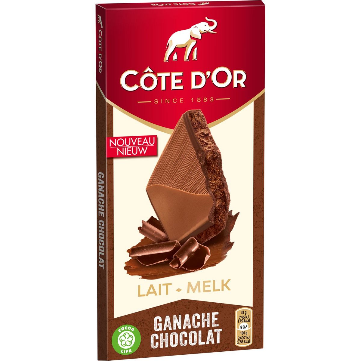 Toute la générosité d'une ganache onctueuse dans une tablette gourmande de chocolat au lait Côte d'Or Ganache Chocolat et Chocolat au Lait. Chocolat au lait fourré crème confiseur au cacao (49%).