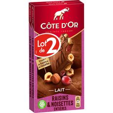 Chocolat au lait aux noisettes entières et aux raisins.