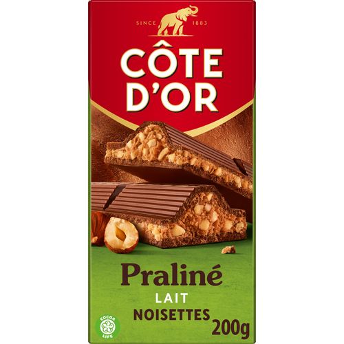 Côte d'Or Praliné Lait Double Noisettes : Ressentez la double sensation du croquant de l'enrobage de chocolat au lait Côte d'Or et du fondant du fourrage praliné intérieur au bon goût de noisettes. Depuis 1883, Côte d'Or sélectionne les meilleures fèves de cacao à travers le monde pour donner à son chocolat ce caractère généreux, intense et unique