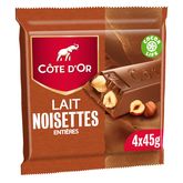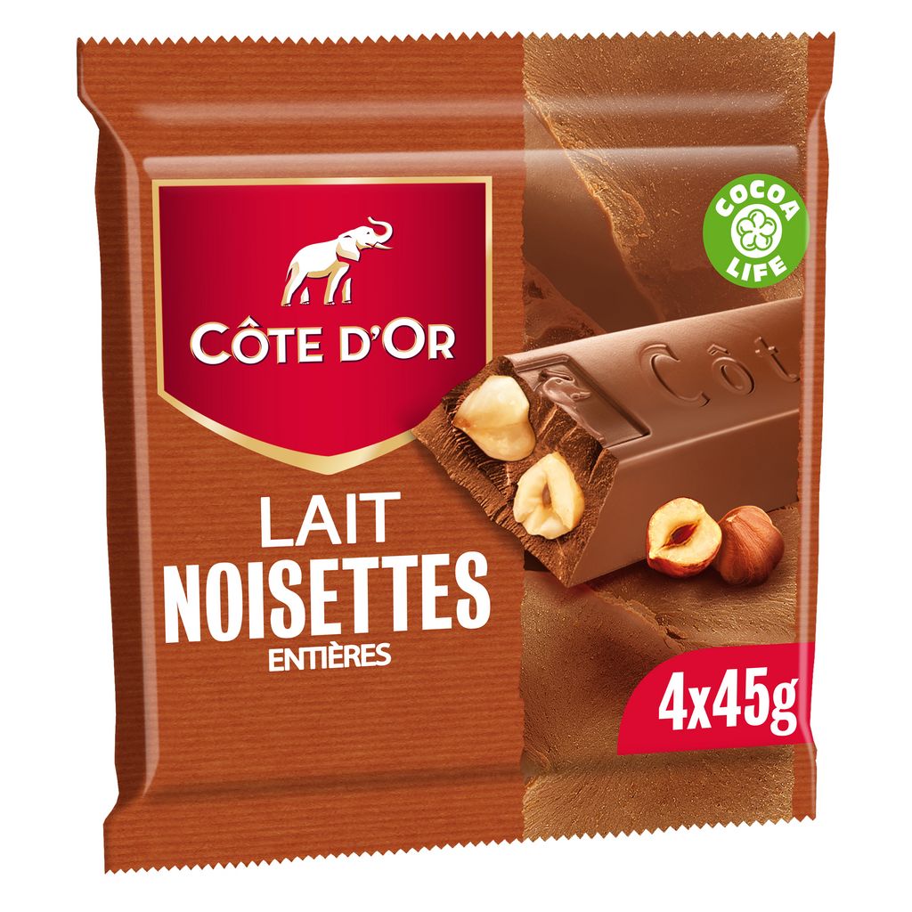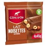 Retrouvez les sensations gourmandes du chocolat Lait Noisettes Côte d'Or en barres individuelles.