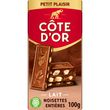 Côte d'Or Lait Noisettes : Goûtez au fondant du chocolat au lait Côte d'Or allié au croquant de délicieuses noisettes entières. Un chocolat généreux pour des sensations gourmandes et intenses ! Au format petit plaisir Depuis 1883, Côte d'Or sélectionne les meilleures fèves de cacao à travers le monde pour donner à son chocolat ce caractère généreux, intense et unique