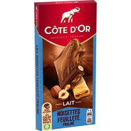 Découvrez la générosité de Côte d'Or Bloc ! Le craquant du biscuit feuilleté, le fondant du praliné et la générosité des noisettes vous offriront un véritable moment gourmand. Chocolat au lait au biscuit feuilleté (4 %), au praliné (32 %) et aux noisettes entières (12 %).