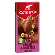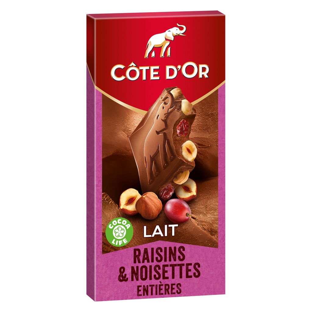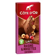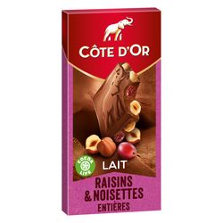 Côte d'Or Lait Raisins Noisettes : Goûtez au fondant du chocolat au lait Côte d'Or allié aux raisins secs et au croquant de délicieuses noisettes entières. Depuis 1883, Côte d'Or sélectionne les meilleures fèves de cacao à travers le monde pour donner à son chocolat ce caractère généreux, intense et unique