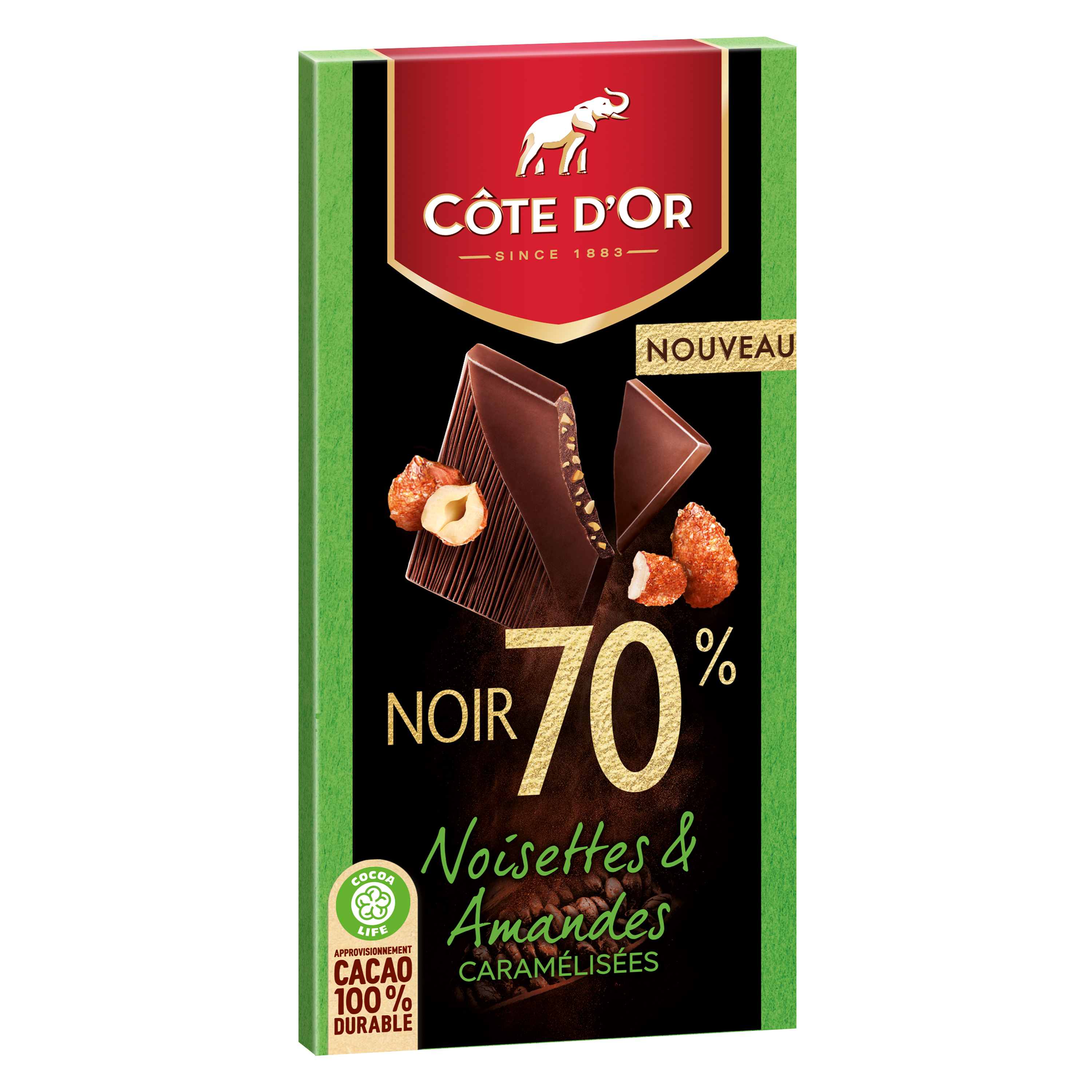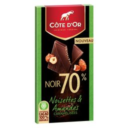 Côte d'Or Noir 70% Noisettes et Amandes Caramélisées : Retrouvez toute l'intensité du chocolat noir Côte d'Or 70% associée à des éclats croquants de noisettes et d'amandes caramélisées dans une fine tablette, pour une expérience de dégustation unique Depuis 1883, Côte d'Or sélectionne les meilleures fèves de cacao à travers le monde pour donner à son chocolat ce caractère généreux, intense et unique