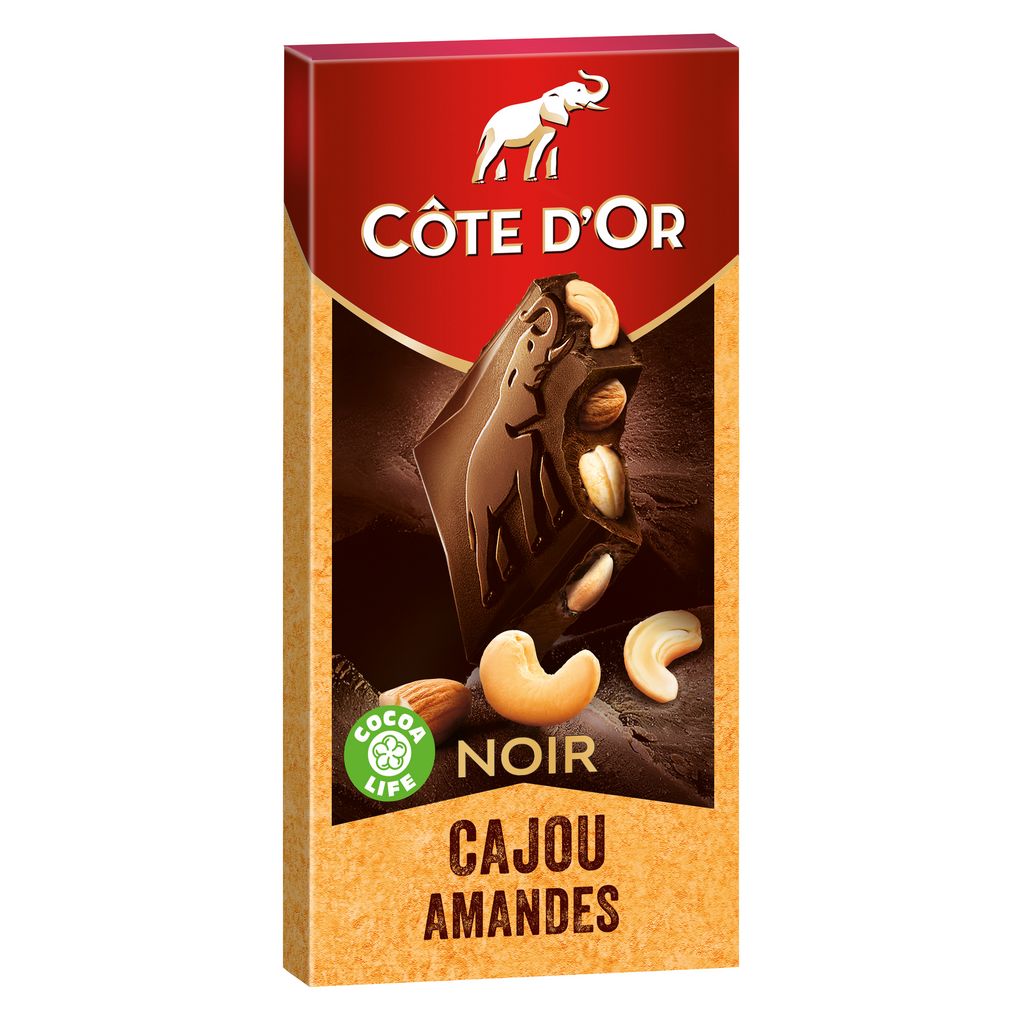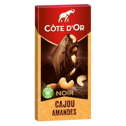 Chocolat noir extra-supérieur aux morceaux de noix de cajou grillées et amandes grillées.