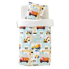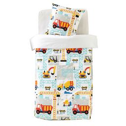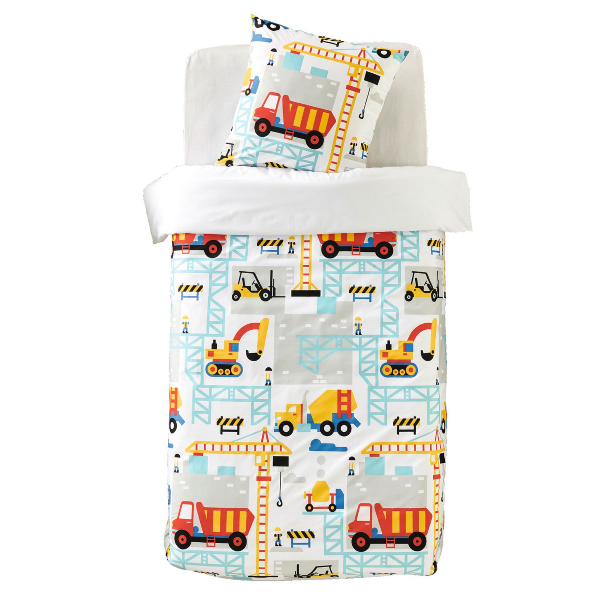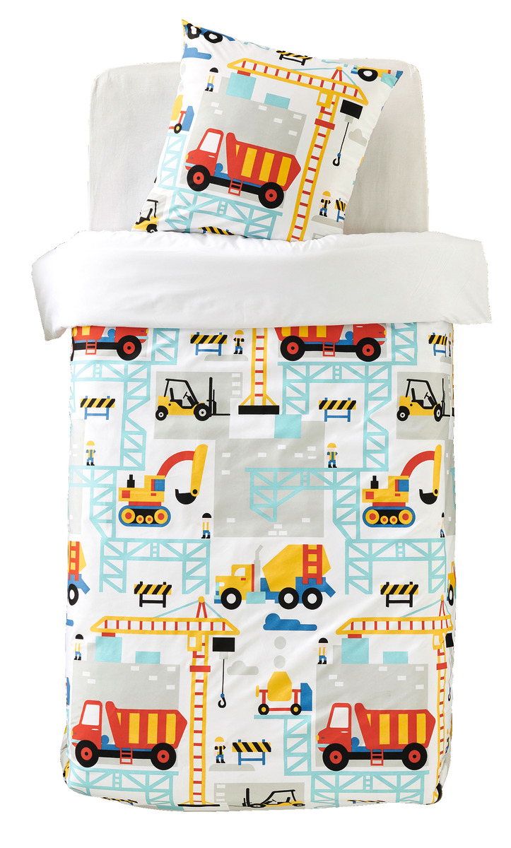 Parure housse de couette enfant (à base droite) + 1 ou 2 taie(s) d'oreiller en microfibre. Un motif "engins de chantier" complètement craquant et des couleurs joyeuses pour un linge de lit créateur de bonheur, et une microfibre légère, super douce et très confortable (tiède en hiver, fraîche en été) qui sèche en un clin d'oeil et ne se repasse pas. A noter, la housse de couette 200 x 200 convient très bien aux lits 1 personne, elle retombe alors davantage sur les côtés pour un confort au top.