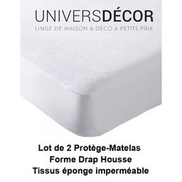 Exceptionnel vendu en Lot de 2 Protège matelas imperméable, absorbant et anti-acariensComposition : Dessus éponge 80% polyester / 20% CotonDessous plastifié PEVABonnet extensible jusqu'à 25 cmDisponible en 4 dimensions au choix : 90 x 190 cm pour lit 1 place 90 x 190 cm140 x 190 cm pour lit 2 plac