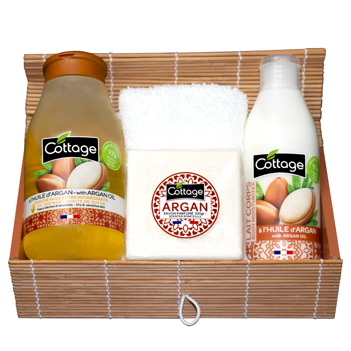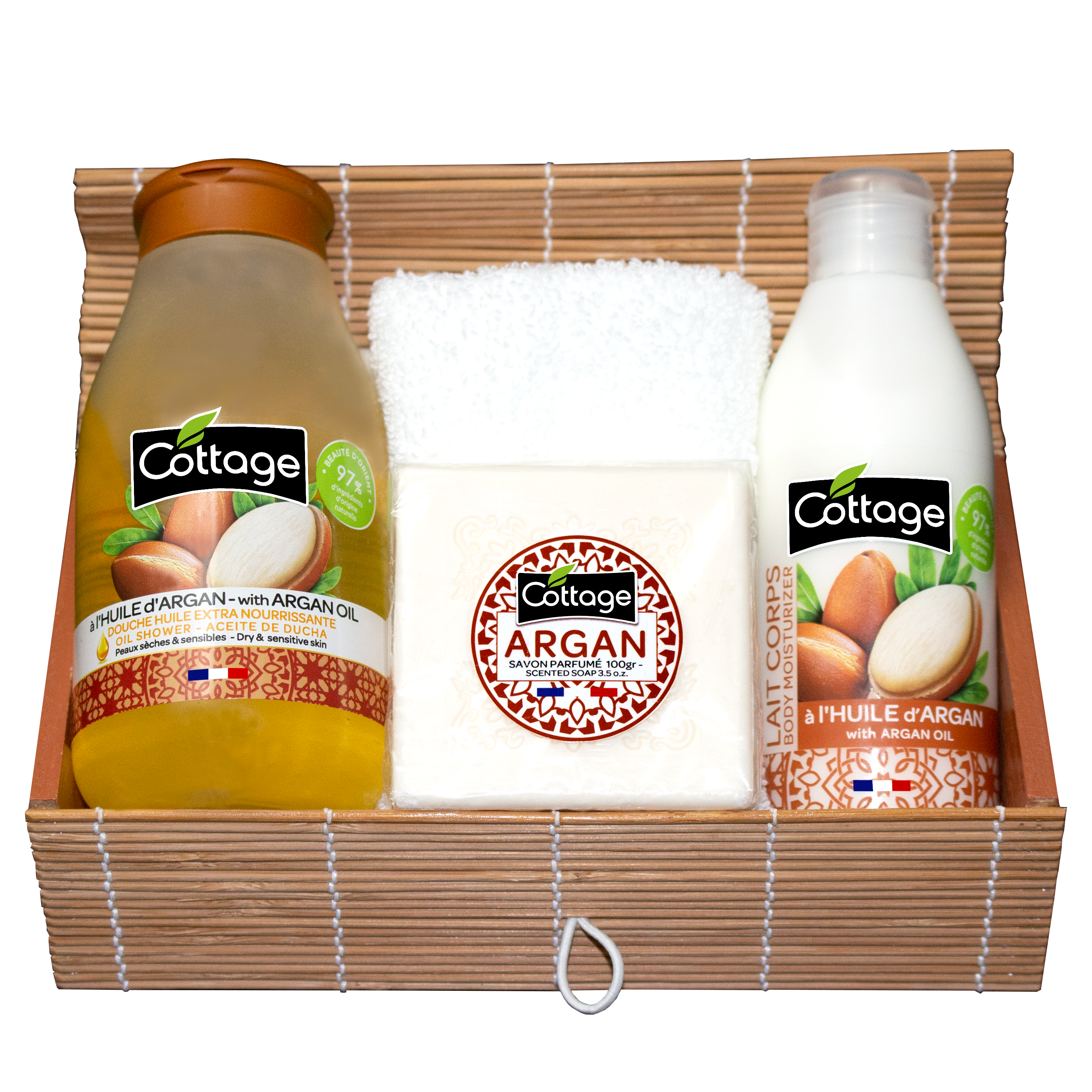 Douche Argan : Aqua (Water), Ammonium Lauryl Sulfate, Cocamidopropyl Betaine, Decyl Glucoside, Glycerin, Parfum (Fragrance), Citric Acid, Coco-Glucoside, Glyceryl Oleate, PEG-40 Hydrogenated Castor Oil, Argania Spinosa Kernel Oil, Sodium Hydroxide, Tocopherol, Hydrogenated Palm Glycerides Citrate, Sodium Benzoate, Benzoic Acid, CI 19140 (Yellow 5), CI 15510 (Orange 4). Lait Corps : Aqua (Water), Helianthus Annuus (Sunflower) Seed Oil, Caprylic/Capric Triglyceride, Glycerin, Dicaprylyl Carbonate, Glyceryl Stearate, PEG-100 Stearate, Butyrospermum Parkii (Shea) Butter, Glyceryl Behenate, Xanthan Gum, Cetyl Alcohol, Argania Spinosa Kernel Oil, Citric Acid, Sodium Hydroxide, Dehydroacetic Acid, Parfum (Fragrance), Benzyl Alcohol. Savon : Sodium Palmate, Sodium Palm Kernelate, Aqua (Water), Parfum (Fragrance), Palm Acid, Sodium Thiosulfate, Glycerin, Palm Kernel Acid, Sodium Chloride, Argania Spinosa Kernel Oil, Tetrasodium EDTA, Sodium Hydroxide, Tetrasodium Etidronate.