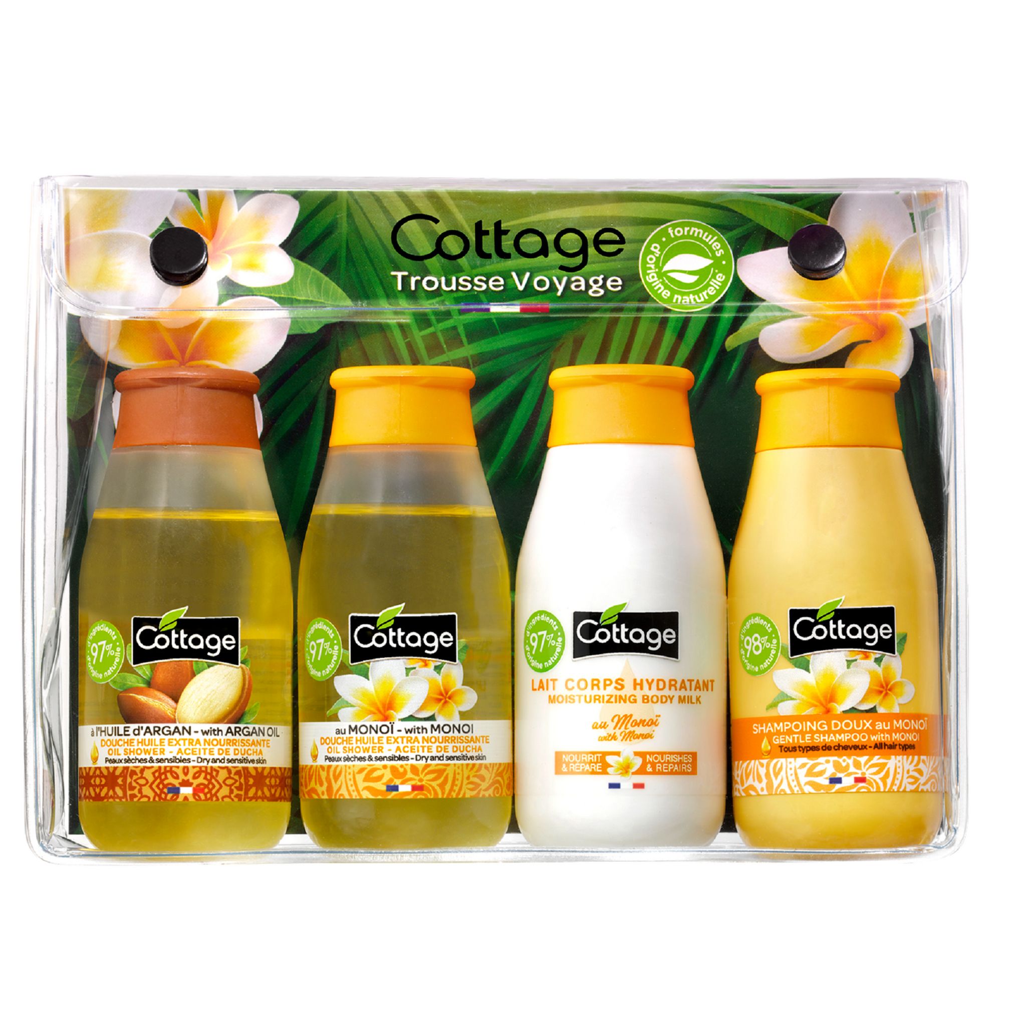 Trousse Voyage contenant Douche Huile Douche Huile Monoï 50ml, Douche Huile Argan 50ml, Lait Corps Monoï 50ml, Shampoing Monoï 50ml