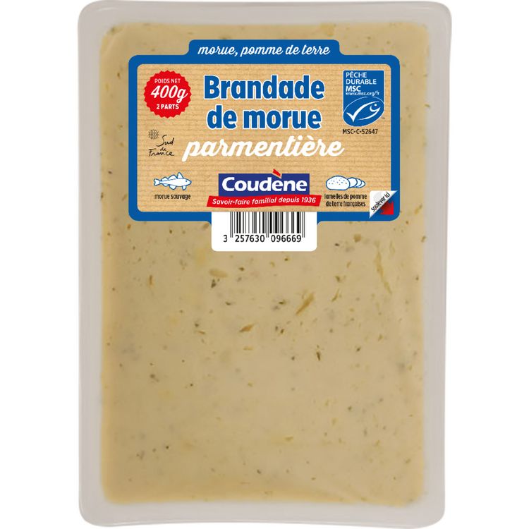 Recette authentique du parmentier à base de la traditionnelle brandade de morue et de vraies lamelles de pomme de terre françaises. La morue utilisée dans nos parmentiers est issue d’une pêche responsable et durable et s’est donc vu décerner l’écolabel MSC.