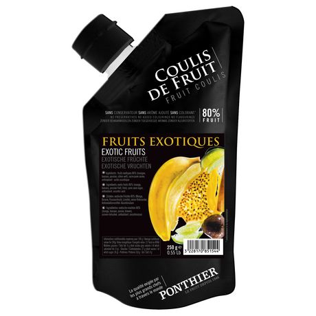 Fruits exotiques 82% (mangue, banane, passion, citron Vert), sirop de sucre inverti, antioxydant : acide ascorbique.