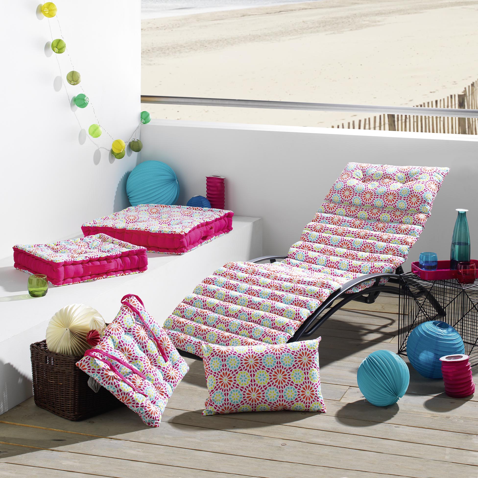 En savoir +Un coussin pour chaise longue ou fauteuil bain de soleil imprimé d'un motif joyeux aux couleurs acidulées. Côté confort, un matelassage généreux et un oreiller intégré. Et côté pratique, ce matelas s'enroule sur lui-même et s'attache par des liens à nouer. Le complice du farniente au soleil, qu'on associe aux coussins de sol assortis parce que c'est encore plus sympa !