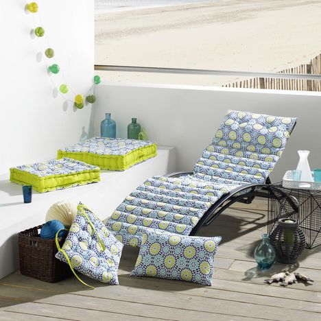 Un coussin pour chaise longue ou fauteuil bain de soleil imprimé d'un motif joyeux aux couleurs acidulées. Côté confort, un matelassage généreux et un oreiller intégré. Et côté pratique, ce matelas s'enroule sur lui-même et s'attache par des liens à nouer. Le complice du farniente au soleil, qu'on a