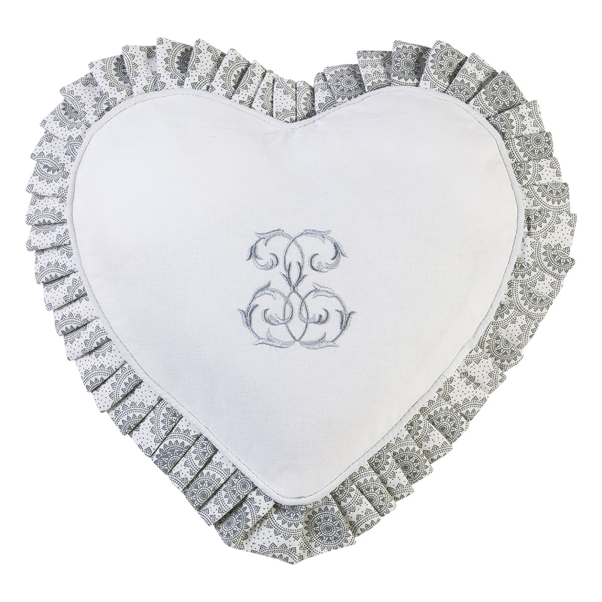 Forme coeur, harmonie de gris, monogramme brodé et petits plis, un coussin très raffiné, pile dans la tendance "néo traditionnelle" qu'on adore aujourd'hui. Un coussin revêtu de toile pur coton de belle qualité et déhoussable, qu'on s'offre avec housses de chaise, rideaux et autres coussins coordonn