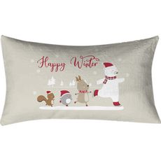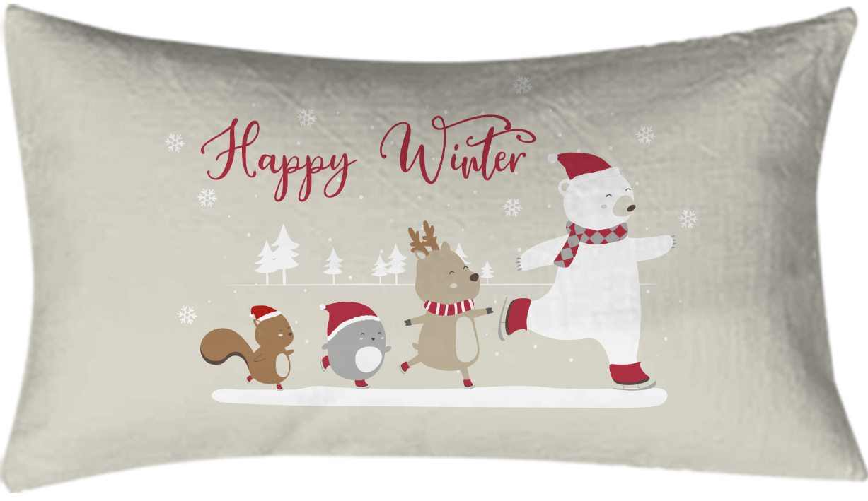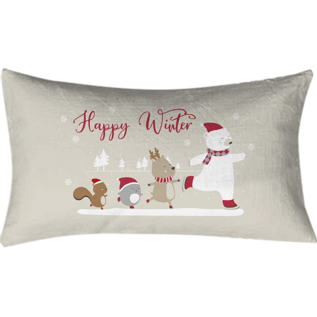 Coussin fantaisie en coton HAPPY WINTER à la patinoire, pour une vrai ambiance de Noël !