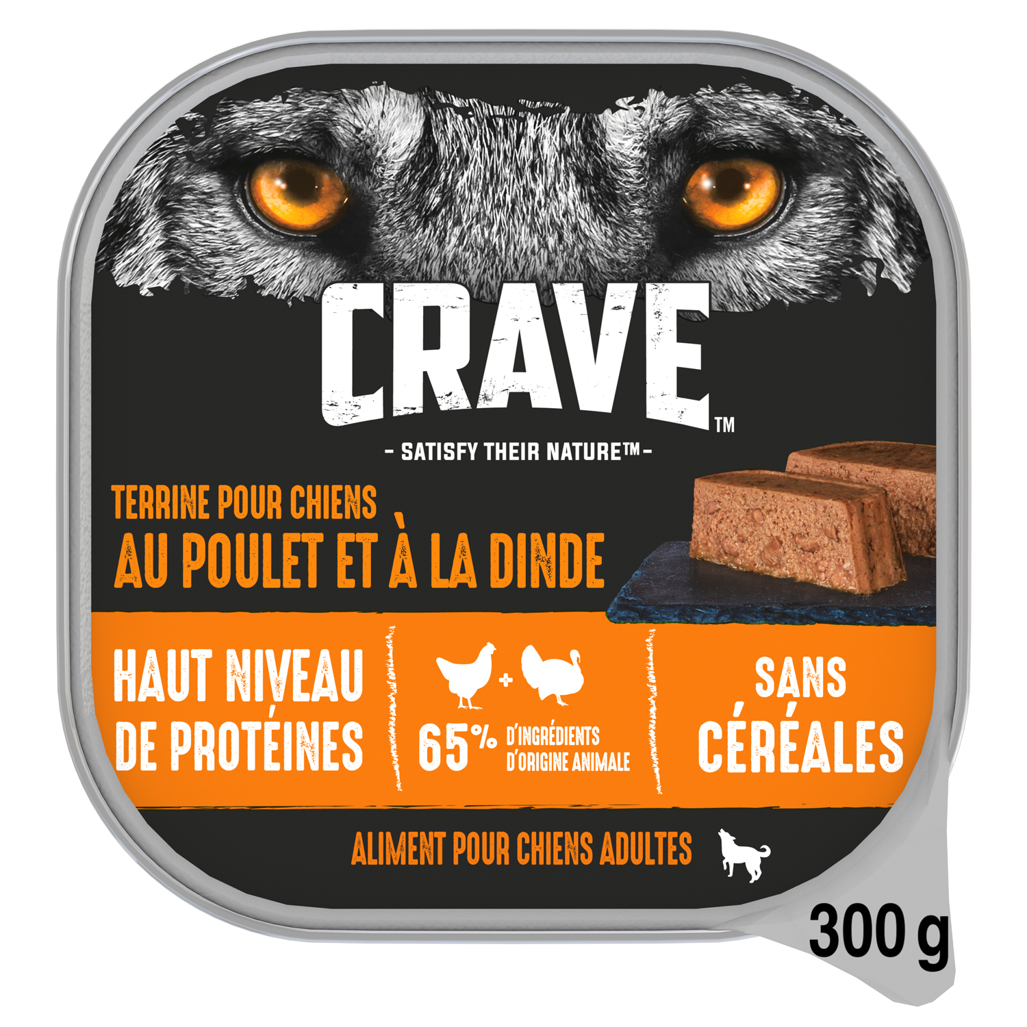 Les barquettes pour chiens adultes CRAVE™ riches en protéines et sans céréales sont disponibles en format 300g.