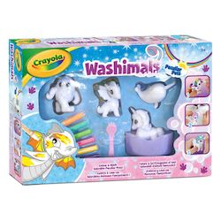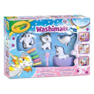 Il y a de la magie dans l'air chez les Washimals ! Ce kit de coloriage contient quatre créatures fantastiques Washimals à décorer et à chouchouter. Utilise les 6 feutres lavables fournis avec les Washimals pour les décorer et les colorier sans fin. Si tu adores les licornes et les dragons, tu vas passer un merveilleux moment à les orner de milliers de dessins différents. Tu as fini de les colorier ? C'est le moment de donner un bain à tes nouvelles créatures préférées pour les laver. Frotte-les avec la petite brosse incluse pour effacer l'encre. Les voilà tout propres, prêts à recevoir de nouveaux motifs et de nouvelles couleurs ! Un plaisir à renouveler sans limite !. Le jeu contient 4 Washimals, un décor féérique, 6 feutres lavables, une baignoire et une brosse. Ce jeu créatif est un merveilleux cadeau pour les enfants à partir de 3 ans. À propos des Washimals. Colorie ces petits animaux trop mignons, chouchoute-les et fais-leur prendre un bain pour recommencer sans fin : les Washimals© de Crayola sont faits pour ça ! Crayola présente une gamme d'animaux à collectionner, à colorier et à personnaliser. Donne à tes animaux préférés un look coloré et original. Une fois que tu as bien joué avec eux, donne-leur un bain pour les laver sous l'eau. Mouille-les, brosse-les et laisse-les sécher avant de recommencer. Les couleurs et les motifs que tu leur donnes sont innombrables, et le plaisir sans fin !