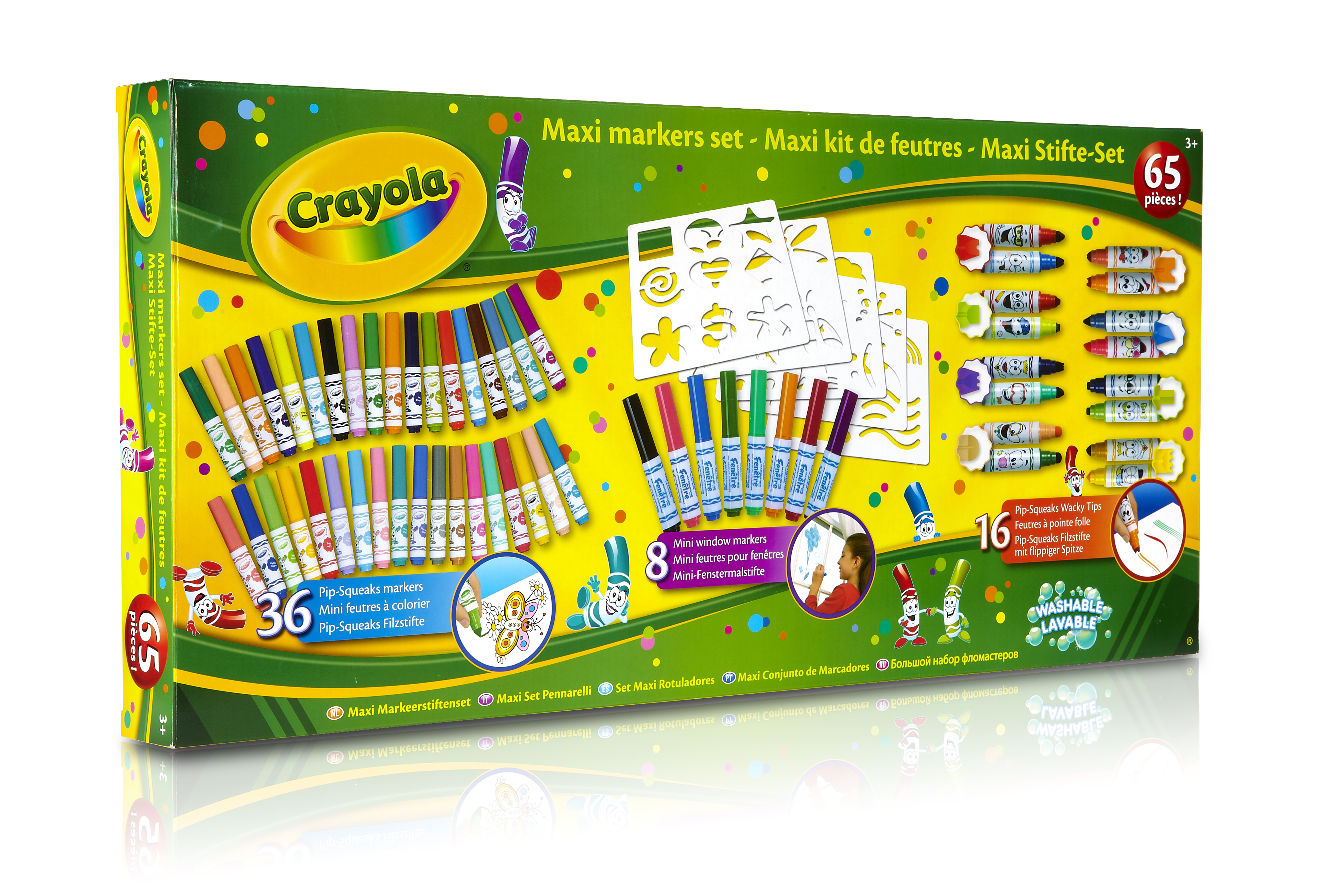 - Des pochoirs sont aussi inclus pour de superbes effets sur le papier comme sur les fenêtres ! L'encre des feutres se lave de la peau avec de l'eau et du savon et des textiles lavables en machine en cycle normal. Pour une parfaite sécurité, l’embout est solidement fixé et le capuchon est ventilé.