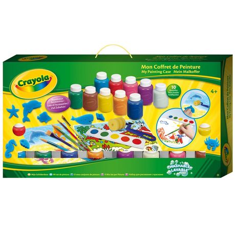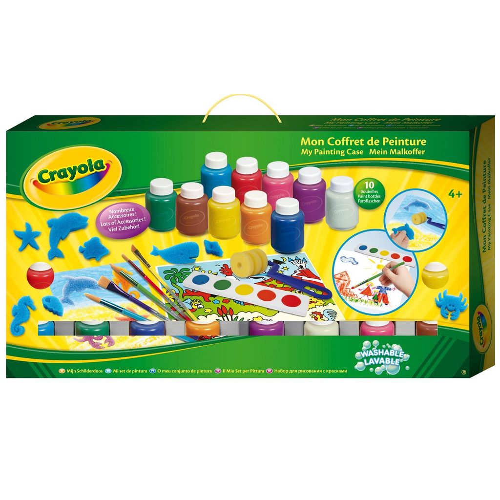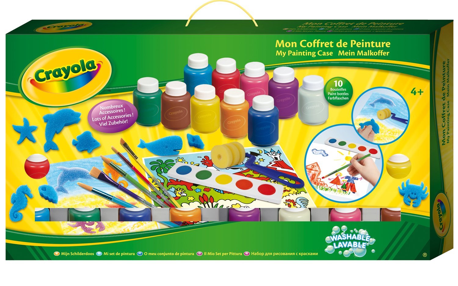 Découvre ce superbe coffret de peinture très complet Crayola, contenant différents types de peintures ainsi que de nombreux accessoires ! La peinture des bouteilles ne tâche pas la peau. Il suffit de frotter : la peinture s’effrite et part très facilement.