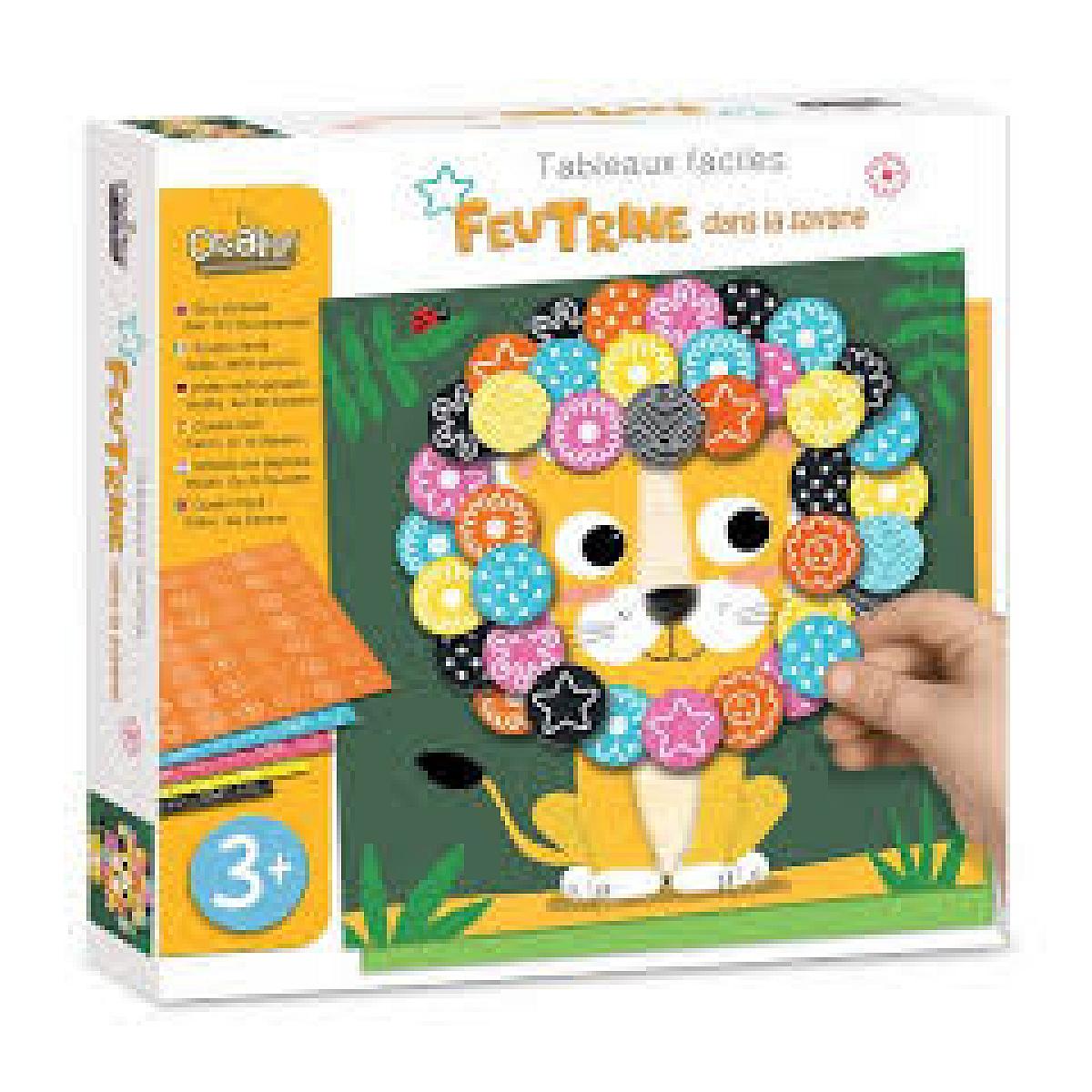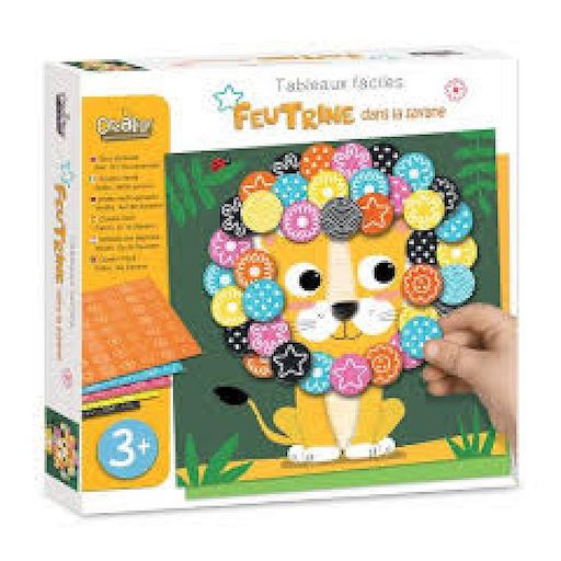 Crée facilement tes premiers tableaux en relief à l'aide des gommettes de feutrine autocollantes. Une fois terminés, tu pourras les exposer sur le joli chevalet fourni.