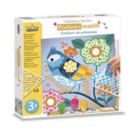 Un coffret idéal pour développer le sens artistique des jeunes enfants. Il contient de jolies cartes d'animaux annonçant l'arrivée du printemps (colibri, papillon, mésange, libellule, rouge-gorge). Pour décorer les cartes il faudra venir tamponner soigneusement les motifs à travers les pochoirs (lavable à l'eau savonneuse). Grâce au chevalet fourni les enfants pourront exposer leur tableau.