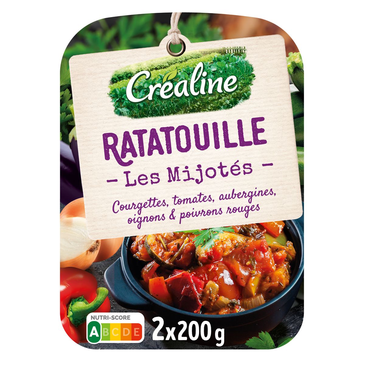 Légumes 96% (courgettes, pulpe de tomate, aubergines préfrites et, oignons préfrits dont huile de tournesol, poivrons rouges), ail, huile d'olive vierge extra, sel, thym, amidon de riz.