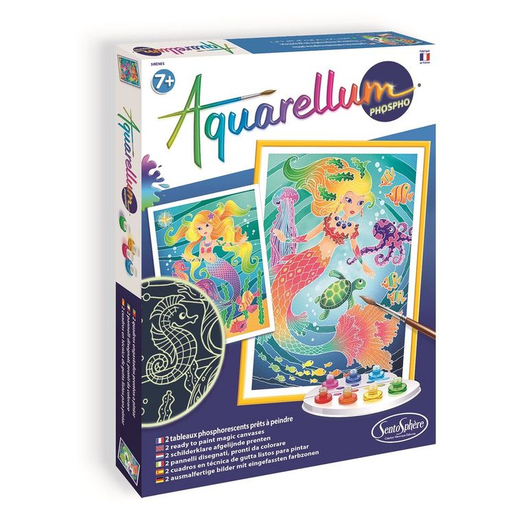 le coffret Aquarellum phospho sirènes de Sentosphère, un coffret créatif avec un serti phosphorescent qui permettra aux tableaux de briller de mille feux une fois la lumière éteinte. Une activité de peinture pour les enfants à partir de 7 ans. Aquarellum phospho développé pour les 20 ans d'Aquarellum propose un serti phosphorescent sur papier vélin, ce qui permet de réaliser un dessin d'un grand raffinement : le pinceau ne déborde pas, les motifs apparaissent comme par enchantement dès que l'on passe les encres, les couleurs vous surprendront par leur éclat, et les contours s'illumineront dans le noir! Une activité manuelle idéale pour initier les enfants à l'art en comprenant le mélange des couleurs, stimuler l'l'imaginaire et la concentration. Le coffret comprend 2 tableaux sertis 25 x 32,5 cm, 7 flacons d'aquarelles lavables et non toxiques, 1 pinceau aquarelle de très grande qualité, 1 palette pour mélanger les peintures, 1 pipette et une notice. Durée de l'activité : 2 à 4 heures Dimensions du coffret : 25,5 x 33,5 x 3 cm Jeu fabriqué en France.