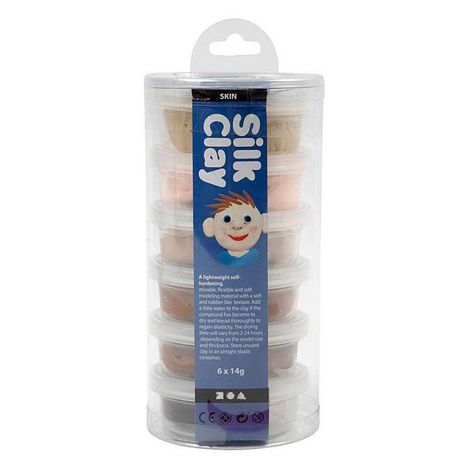 Set de pâte à modeler Silk Clay couleur chair. Cette boîte d'ensemble de pâtes à modeler Silk Clay® est idéale pour une activité manuelle d'enfant. Grâce à cette pâte, les plus jeunes (à partir de 3 ans) auront plaisir à modeler, sculpter, créer des formes 3D ou des décorations. La pâte est applicable sur du bois, du polystyrène ou d'autres matériaux. L'avantage de la pâte à modeler Silk Clay® est qu'elle est auto-durcissante, c'est-à-dire qu'elle se durcie à l'air libre. Vous verrez, l'utilisation est simple et les réalisations sont facilement jolies. Apportez une décoration originale dans une chambre d'enfant, sur une guirlande ou sur des objets. Activité créative géniale à faire lors d'un goûter d'anniversaire ou lors de journées pluvieuses. Ce set contient 6 pots de pâte couleur chair à modeler Silk Clay® de 14 g. Pâte Silk Clay® à modeler 6 couleurs : nuances entre le marron et le beige. Sans gluten. Couleurs miscibles facilement. La pâte durcit au contact de l'air en 2 à 24h. Conserver dans un pot hermétiquement fermé. A partir de 3 ans.