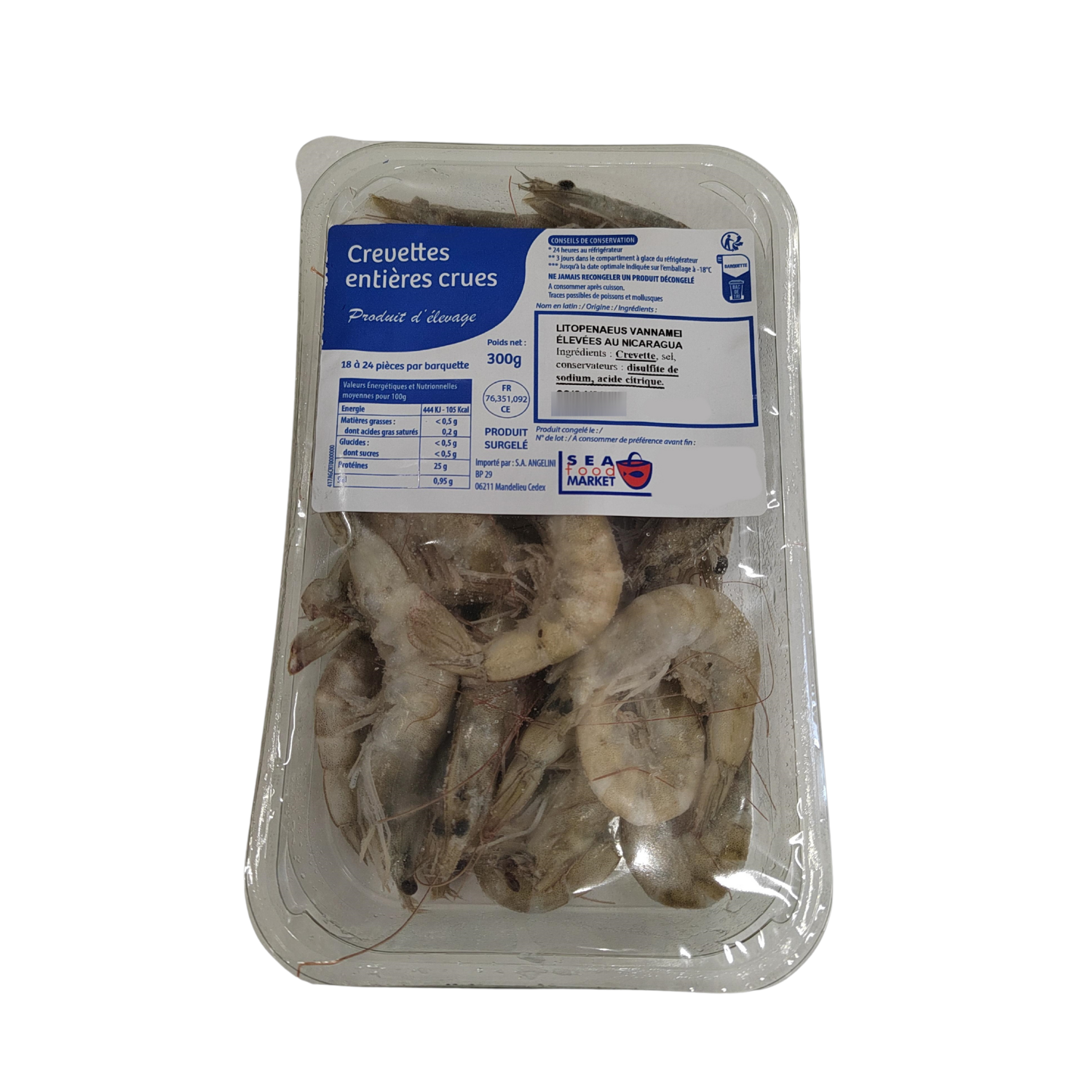Crevettes entières crues surgelées (Litopenaeus vannamei) CRUSTACES, DISULFITE DE SODIUM,acide citrique, sel