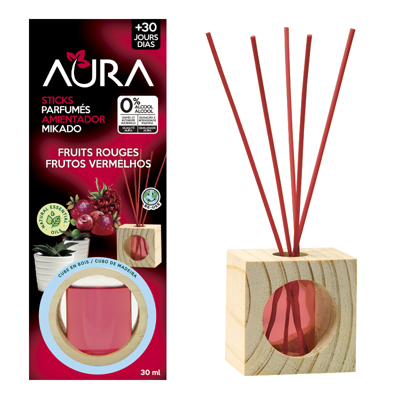 DIFFUSEUR DE PARFUM DÉCORATIF CUBE BOIS BATONNETS FRUITS ROUGES 30 ML - 0 % alcool - Aux huiles essentielles. Diffusion douce et constante avec une intensité préservée pendant 30 jours grâce à sa formule 0% alcool.