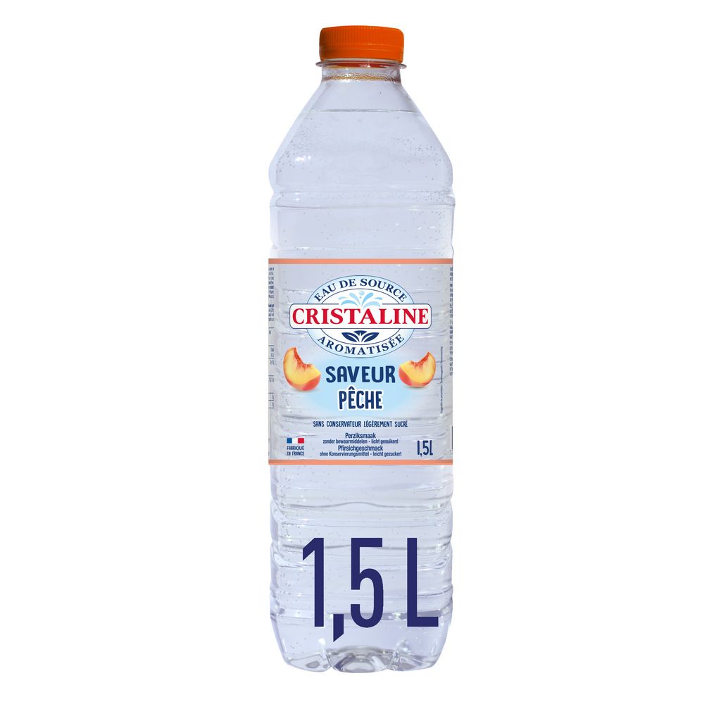 Boisson à l'eau de source Cristaline saveur pêche, avec sucre et édulcorant
