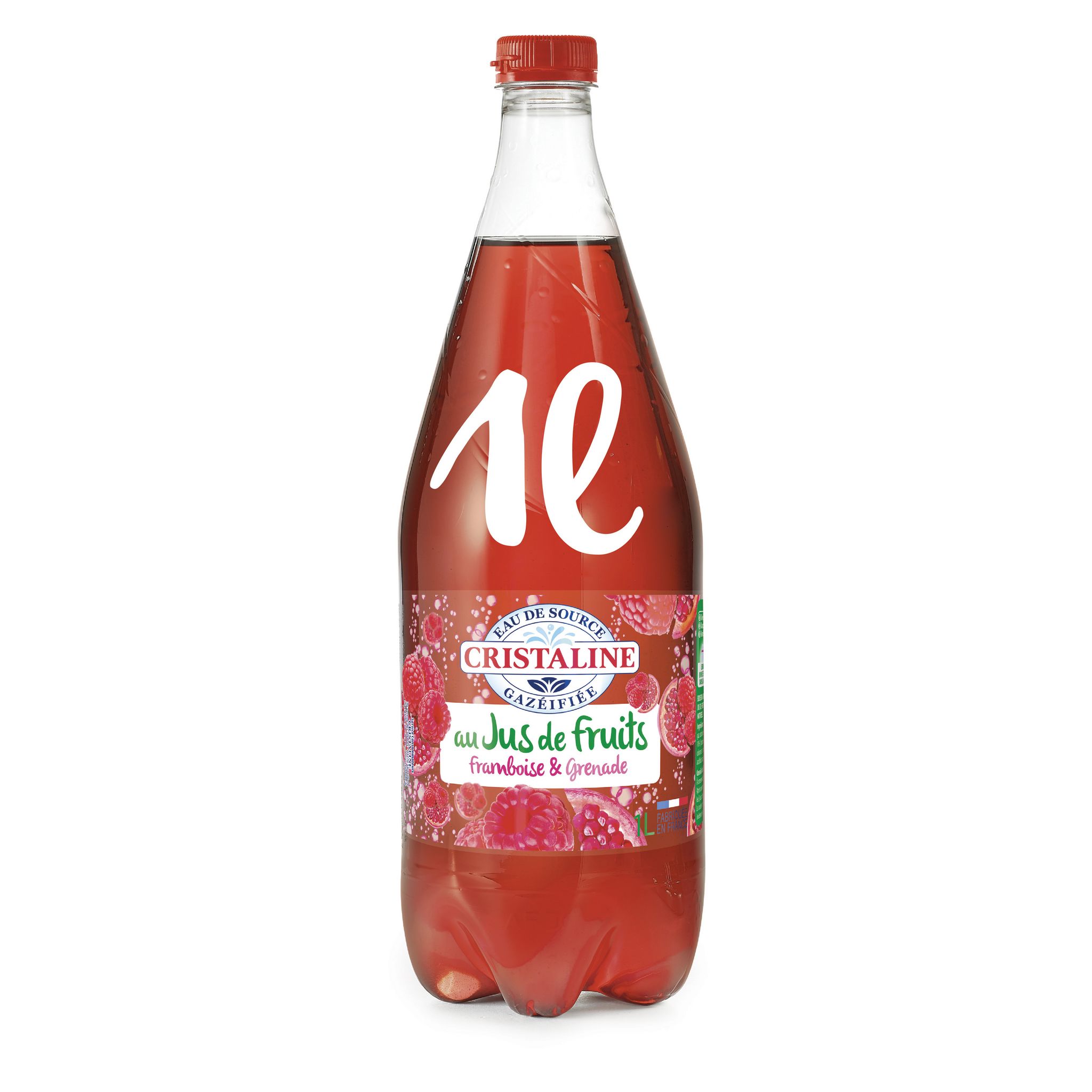 Boisson à l'eau de source Cristaline Gazéifiée avec adjonction de gaz carbonique, au jus de fruits à base de concentrés, à l'arôme naturel framboise & grenade