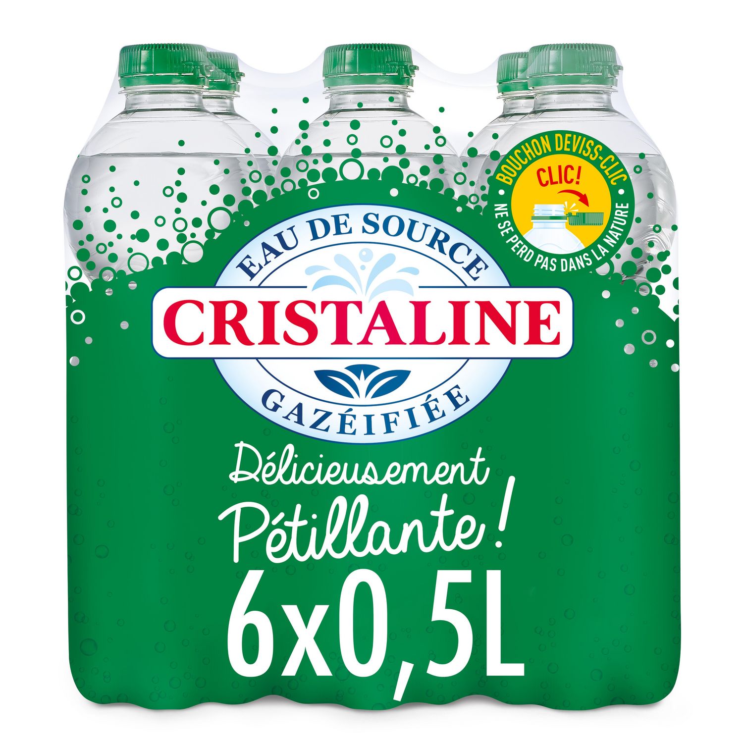 Une eau de source Cristaline de grande qualité faiblement minéralisée et gazéifiée à petit prix. Moins de plastique, entièrement recyclable.