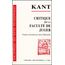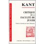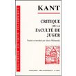 La faculté de juger, qui dans l'ordre de nos facultés de connaître, constitue un terme intermédiaire entre l'entendement et la raison, possède t-elle aussi, considérée en elle-même, des principes a priori , ceux-ci sont-ils constitutifs ou simplement régulateurs (n'indiquant pas ainsi de domaine propre) , donne-t-elle a priori une règle au sentiment de plaisir et de peine, en tant que moyen terme entre la faculté de connaître et la faculté de désirer (tout de même que l'entendement prescrit a priori des lois à la première, mais la raison à la seconde) : telles sont les questions dont s'occupe la présente Critique de la faculté de juger .