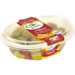 Un air d’Italie pour cette recette d’olives vertes extra charnues et sa nouvelle marinade très gourmande avec poivrons, origan, romarin, une pointe de tomate et un zeste de fraîcheur avec le citron.
