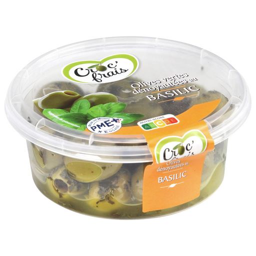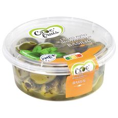 Ingrédients : Olives vertes dénoyautées 83% (sel, acidifiant : acide lactique) (Grèce), huile de colza, basilic 4%, vinaigre d'alcool.