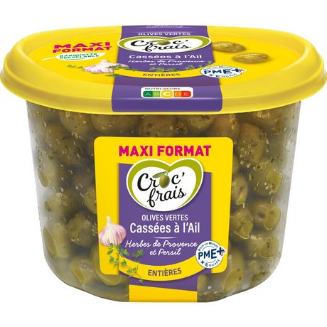 Ingrédients : Olives vertes entières cassées 90,4% (sel, acidifiant: acide lactique), huile de colza, ail 0.39%, herbes de Provence 0.07% (romarin, sarriette, origan