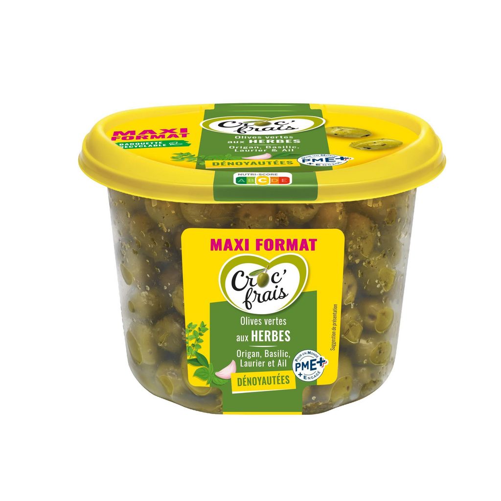 Des olives vertes dénoyautées extra-charnues, dans une marinade à l’huile de colza, aux herbes de Provence (origan, basilic, laurier) et une pointe d‘ail.