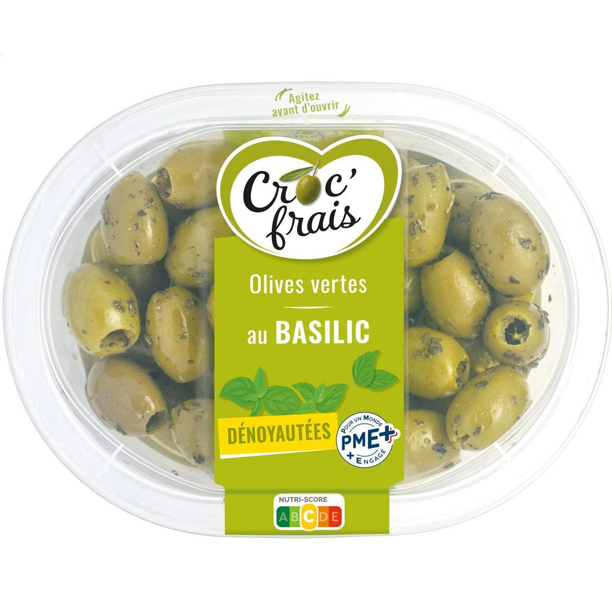 Ingrédients : Olives vertes dénoyautées 79.4% (olives vertes, sel, acidifiant : acide lactique), huile de colza, basilic 0.54%, sel, arome naturel de basilic