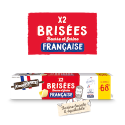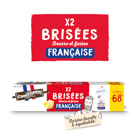 Des pâtes Brisées Origine France Garantie et Agriéthique au bon beurre et à la farine française équitable et locale. Des pâtes de 230g prêtes à l'emploi pour nos Crousti Bakers !