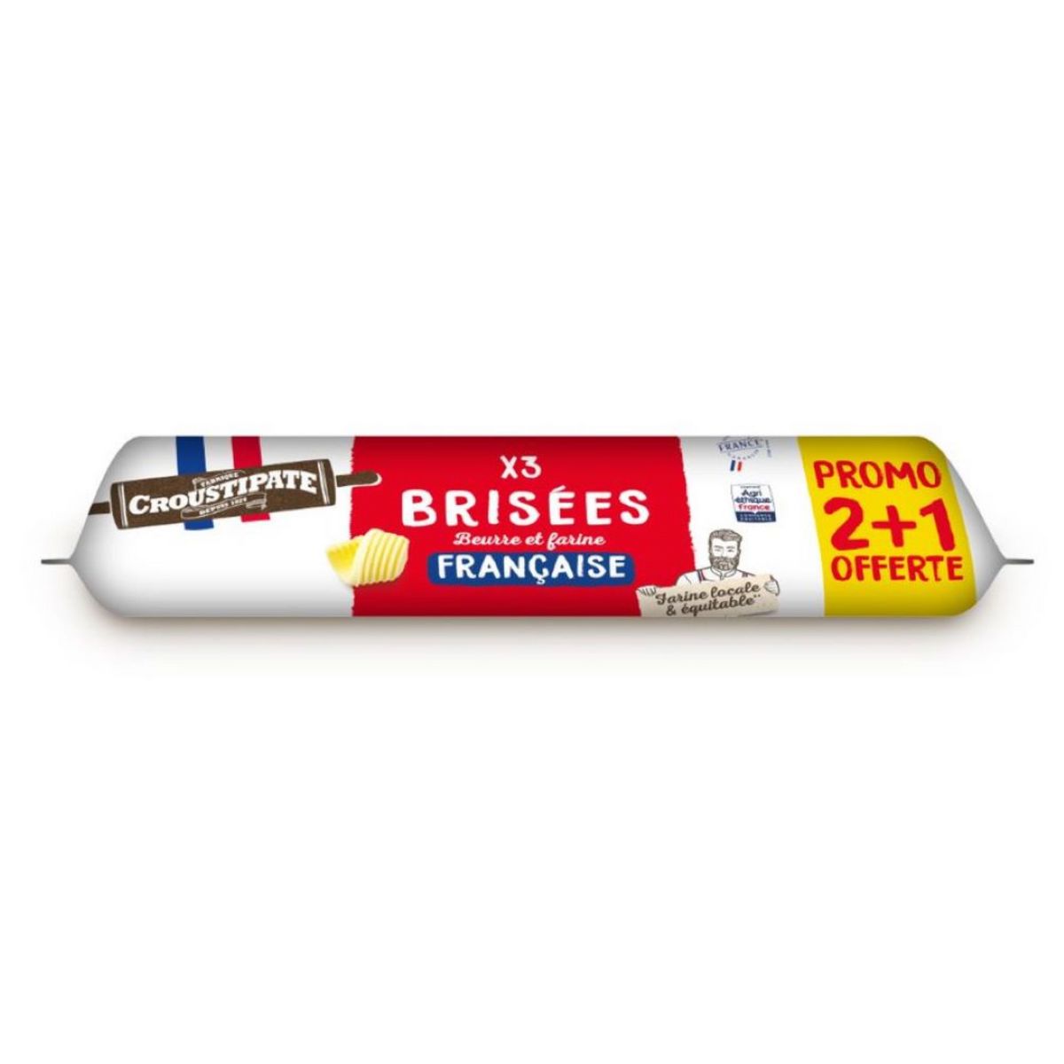 Des pâtes brisées Origine France Garantie et Agriéthique au bon beurre et à la farine française équitable et locale. Des pâtes de 230g prêtes à l'emploi pour nos Crousti Bakers !