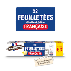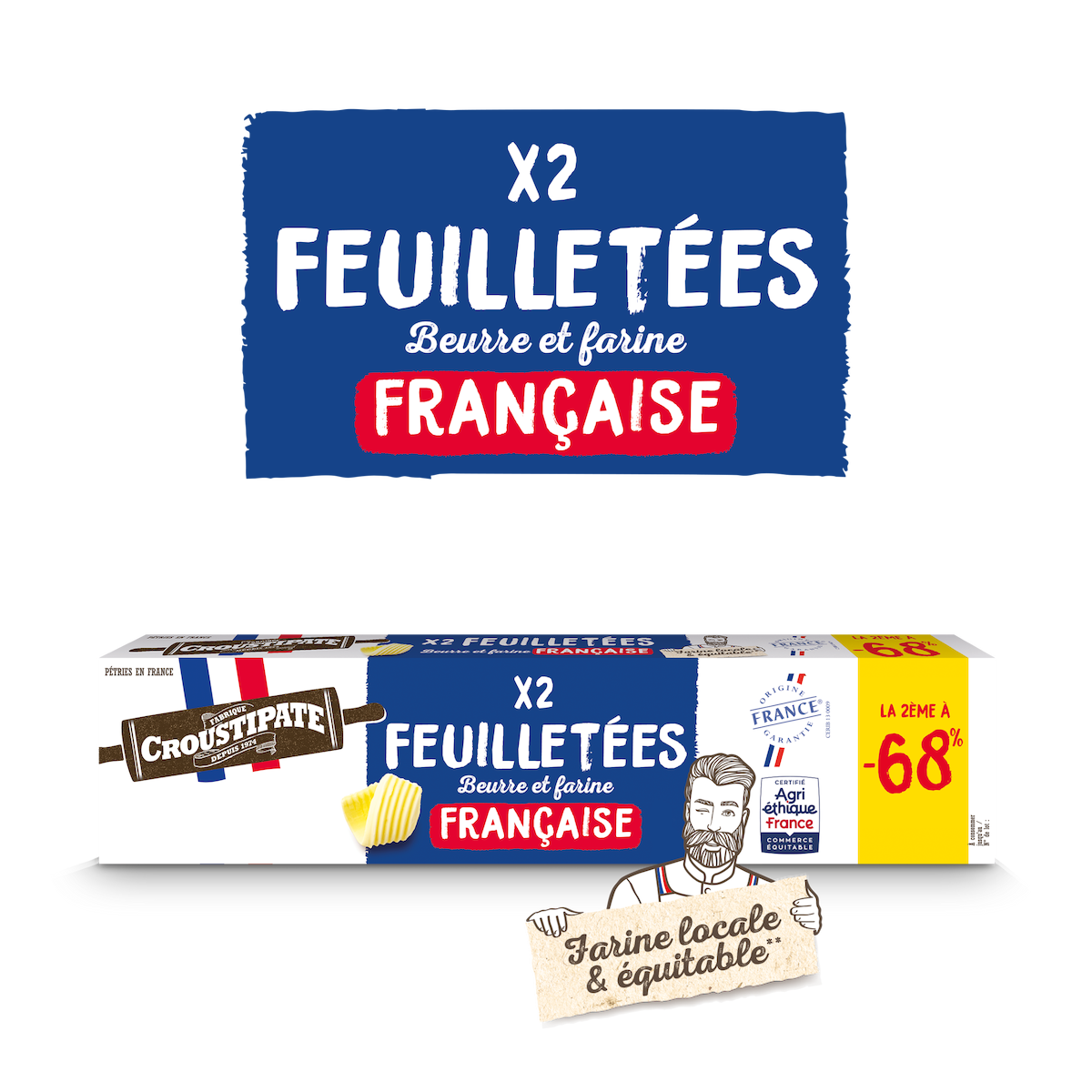 Des pâtes Feuilletées Origine France Garantie et Agriéthique au bon beurre et à la farine française équitable et locale. Des pâtes de 230g prêtes à l'emploi pour nos Crousti Bakers !